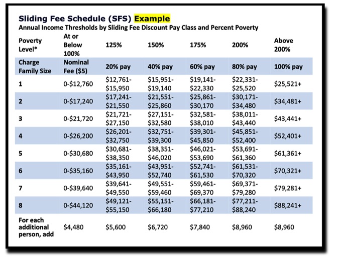 A Sliding Fee Scale is a payment model we will use to care for patients who cannot afford quality health care. For example, those with low-income or who need to self-pay. It allows our facility to provide quality healthcare to patients who would otherwise be unable to afford our services.